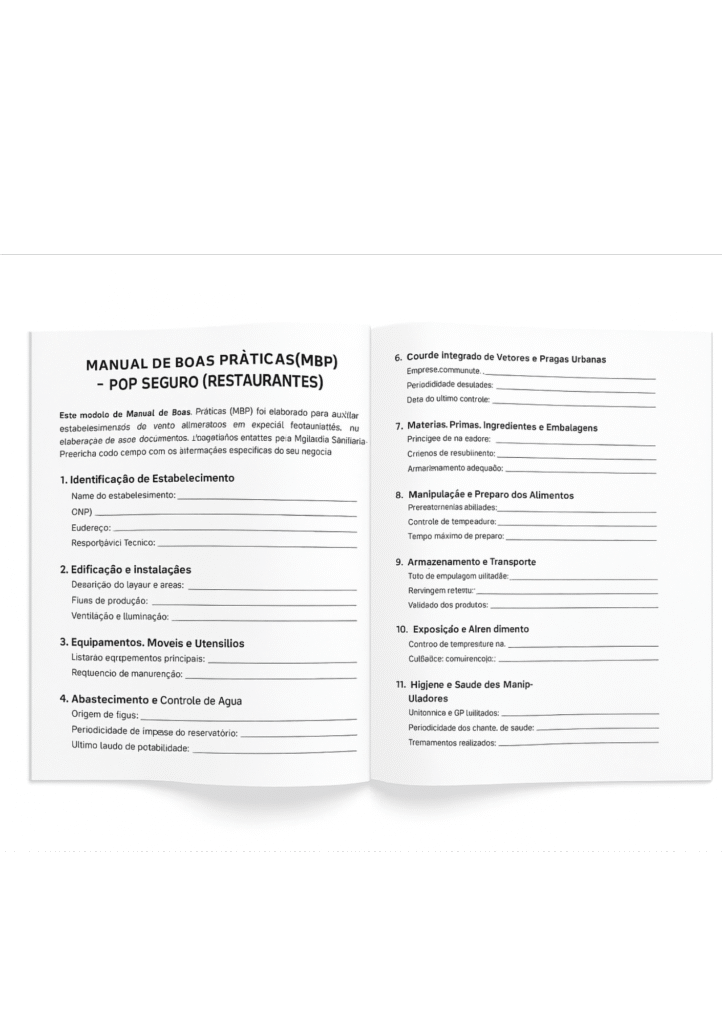 O Kit POP Seguro traz todos os modelos exigidos pela Vigilância Sanitária. Manual de Boas Práticas, POPs e checklists prontos para uso.